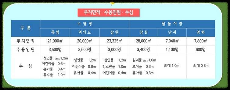 - 폭우로 침수 시 수영장 운영이 일시 중단될 수 있으므로 폭우 시 공지사항을 확인하거나 각 수영장 및 물놀이장으로 문의하여 주시기 바랍니다