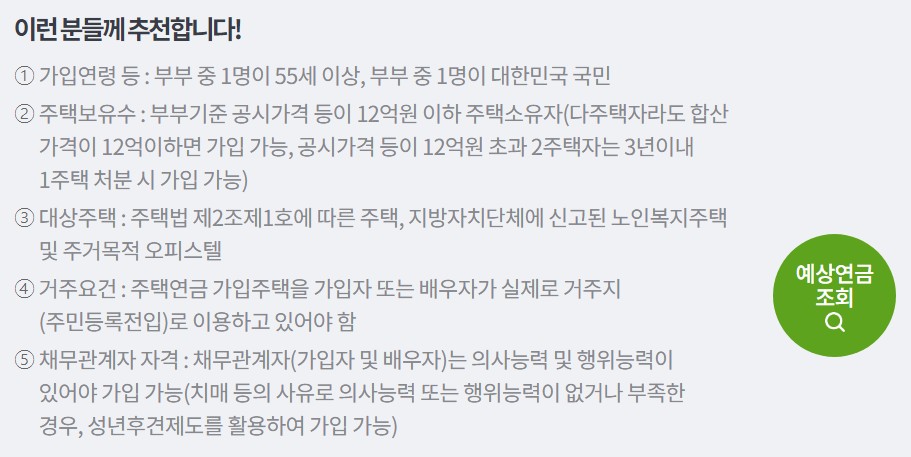 - 주거 안정성 유지: 주택을 처분하지 않고 연금 수령 중에도 평생 그 주택에 거주할 수 있습니다.