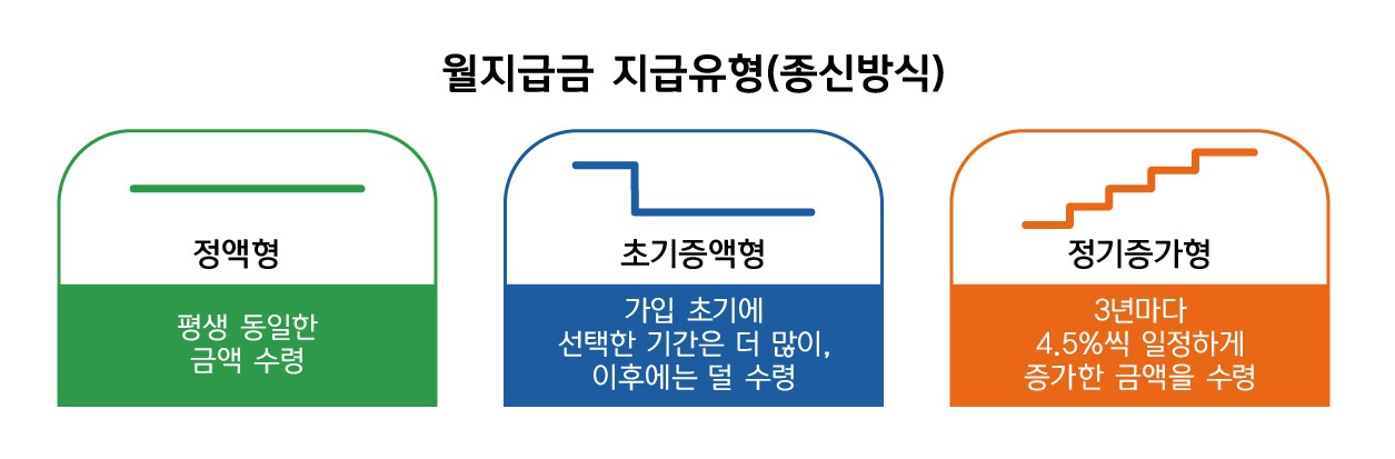 주택연금은 안정성 보장이 되길 원하는 경우가 많아 보통 종신방식을 선호 한답니다. 종신방식은 세가지 방식이 있습니다. 정액형, 초기증액형, 정기증가형으로 선택 가능합니다.
