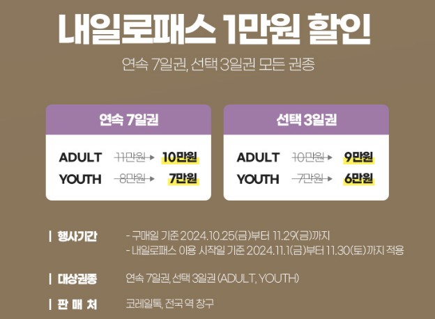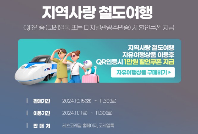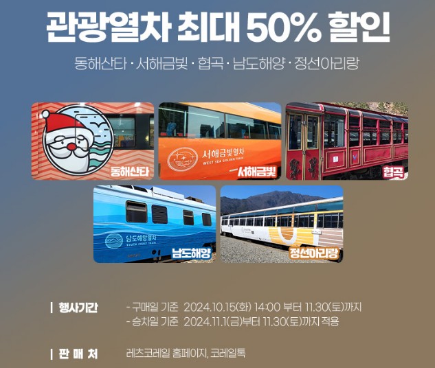 지금은 가을여행 할인을 테마로 지역사랑철도여행, 관광열차 최대 50%할인, 내일로패스 1만원 할인 이벤트를 진행 중 인데요. 이러한 이벤트를 잘 활용하면 여행 비용을 크게 줄일 수 있으니 꼭 티켓 예매 전 할인 공지를 확인해 보시길 바랍니다.